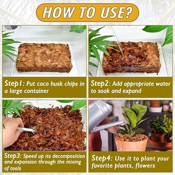 - 𝐂𝐨𝐜𝐨 𝐇𝐮𝐬𝐤 𝐂𝐡𝐢𝐩𝐬 𝐁𝐫𝐢𝐜𝐤 𝐟𝐨𝐫 𝐏𝐥𝐚𝐧𝐭𝐬: Crafted from compressed natural coconut husk chips, each lightweight 1.1 lb brick transforms into a generous 7 quarts of flaky, airy substrate when hydrated. Perfectly revitalizes garden soil or potting mix enhances aeration, drainage, and moisture retention for healthier root growth. Or, spread it as a beautiful, weed-suppressing mulch to elevate your landscape's natural beauty