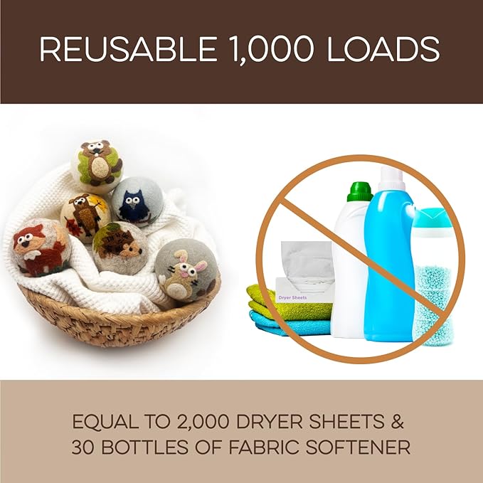 - REUSABLE FOR 1000+ LOADS β REDUCE WASTE: Why keep buying disposable dryer sheets? These cute dryer balls last 1000+ loads, replacing 2000 dryer sheets or 30 bottles of fabric softener. Fluff Ewes dryer wool balls laundry reusable deliver a cost-effective solution for 2-4 years of hassle-free laundry. Make a smarter choice for your wallet and the environment.