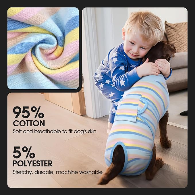- [BREATHABLE FABRIC]: Our dog recovery suit is made of 95% cotton and 5% spandex. The recovery shirt is highly elastic and breathable, allowing the dog to feel comfortable and move freely after wearing it. No deformation after machine wash.