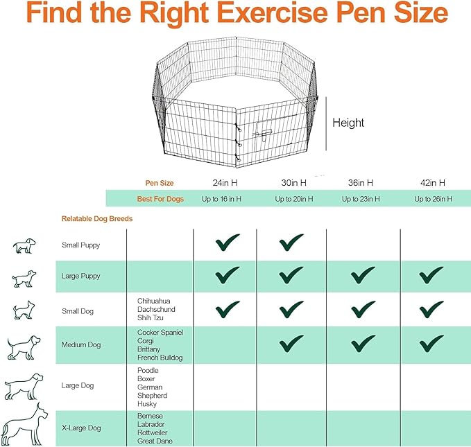 - Two Colors, Four Sizes: Precision Fit Available in classic black and grey, our dog playpen comes in four heights (24"H, 30"H, 36"H, 42"H) with 24"W-wide panels. Whether you have a small or large dog, there’s a perfect size to ensure your pet enjoys a safe, customized space.