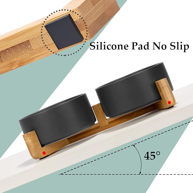 - [Double Bowl Design]:One dog bowl for food and one for water, Each ceramic cat bowl has a Unique wooden stand, raising the dishes closer to your pet for more comfortable eating