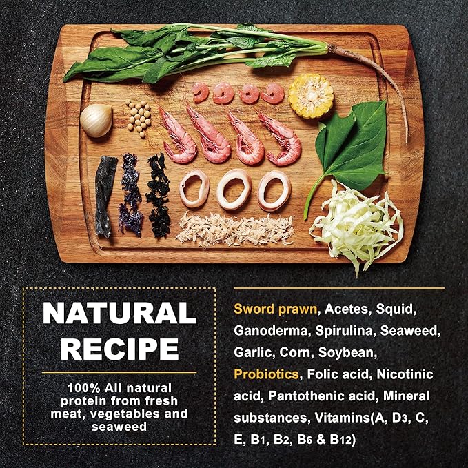 - Superior Quality Ingredient : All natural protein from fresh meat, vegetables and seaweed. No additives, no artificial flavors or coloring, no byproducts and other harmful ingredients. Made with carefully selected ingredients like Sword prawns, acetes, fresh squid, fresh-pick garlic, natural spirulina and seaweed