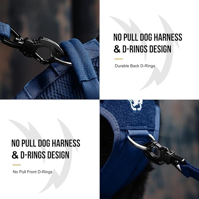 - [No Pull D-ring]: 3 stainless steel D-rings at the front chest and back for training, short and long leashes, with 4 UTX-Duraflex quick-release buckles and 6 fully adjustable straps.