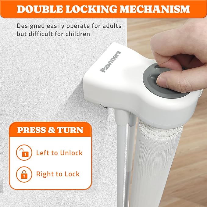- Double Locking Mechanism: The knob (Press & Turn Design) at the top of the baby gate, especially the tall baby gate, ensures easy use for adultsβopen and close with one hand. Meanwhile, curious little ones won't be able to unlock this secure safety gate