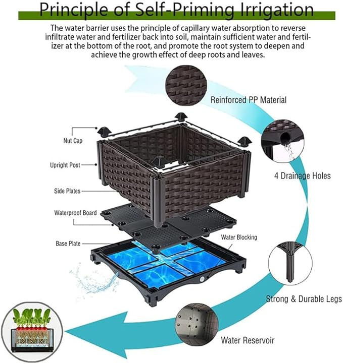 - 🌻【Durable Outdoor Growth Box】Our elevated planter boxes are made of reinforced PP material with a rattan pattern that is durable, lightweight, high load bearing, washable and reusable.