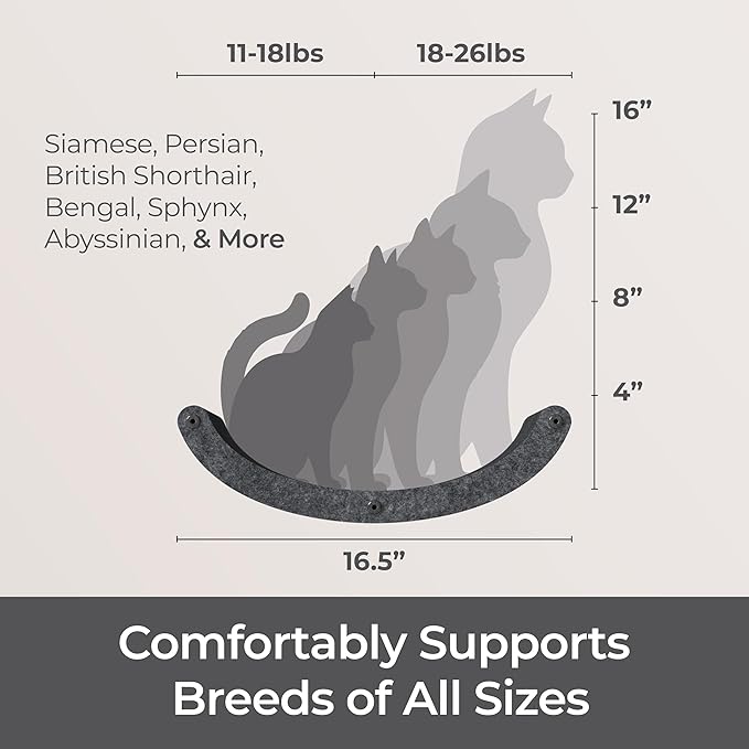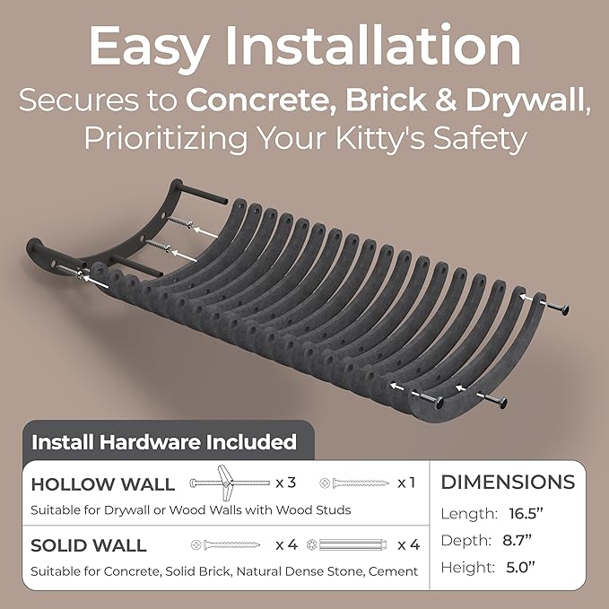 - Effortless Paradise: This cat hammock and wall bed includes all installation hardware, allowing your fur-baby to start exploring right away. Our cat climbing shelf securely attaches to concrete, cement, brick, dry wall and more ensuring your cat’s safety.