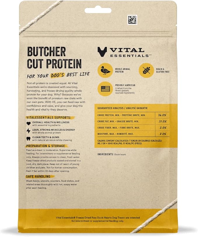 - FREEZE-DRIED RAW DUCK HEART DOG TREATS: Vital Essentials Freeze Dried Raw Dog Treats are a high-protein, low calorie treat that can help support your dog's overall health. These treats contain no artificial preservatives or additives. Duck Heart is the only ingredient.