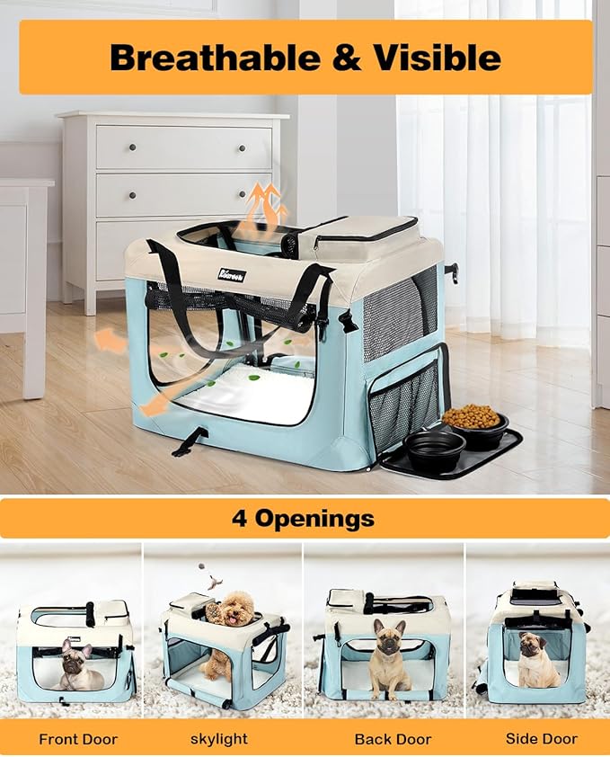 - 【Spacious & Well-Ventilated】Our large dog carrier features five mesh sides for optimal fresh air flow. The spacious dog crate creates a stress-free environment for your pet indoors and allows him to connect with nature and feel the gentle breeze outdoors. In addition, the dog kennel's four doors allow your dog to move freely, ensuring his well-being.