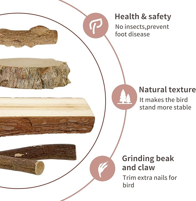 - 【High Quality Wood】Made of 100% Natural Wood, after High Temperature Fumigation and Drying,Our Bird Perches Are Environmentally Friendly, Nontoxic, Durable, Safe for Your Small Pets and in Line with the Requirements of a Bird's Natural Habitat. There May Be Some Wood Chips in the Package, Which Are Dropped by the Tree Skin During Transportation, They Are Not Garbage, Please Understand.