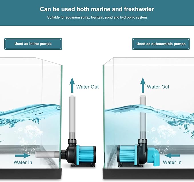 - Wide applicaion and Safty pump: can be used as salt water or fresh water aquarium sump pump, fountain pump,hydroponics pump and waterfall pump;can be used as sumbersible pump and inline pump;