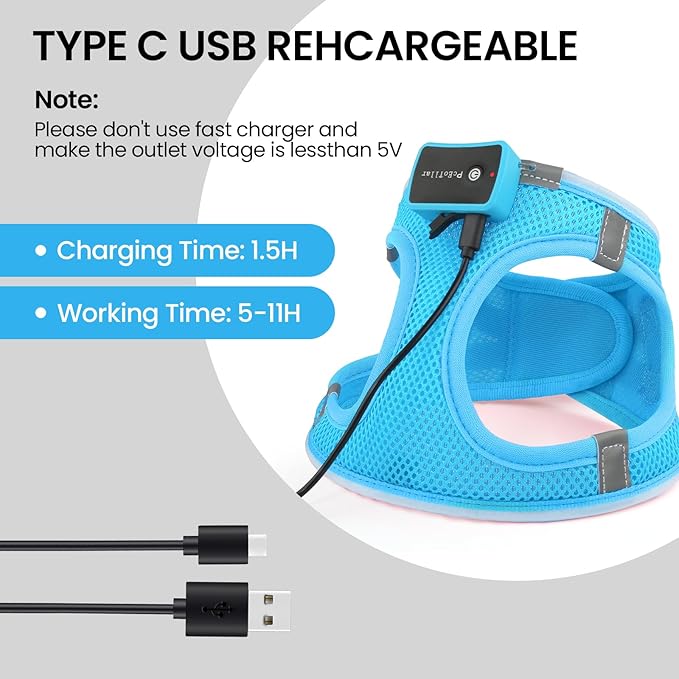 - USB Rechargeable: The LED dog harness is easy to charge using a USB cable. With a large battery capacity, it can last up to 5-11 hours on a single charge, making it perfect for long walks, hikes, and other outdoor activities.