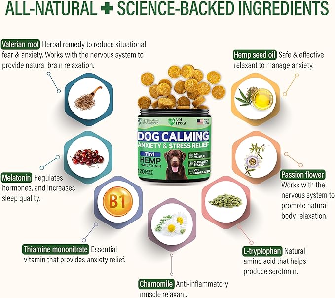 - Effective Anxiety & Stress Relief for Dogs: Vet Treat hemp calming chews for dogs anxiety provide advanced stress relief by helping reduce barking, hyperactivity, separation anxiety, and nervous behavior during thunderstorms, fireworks, or travel.