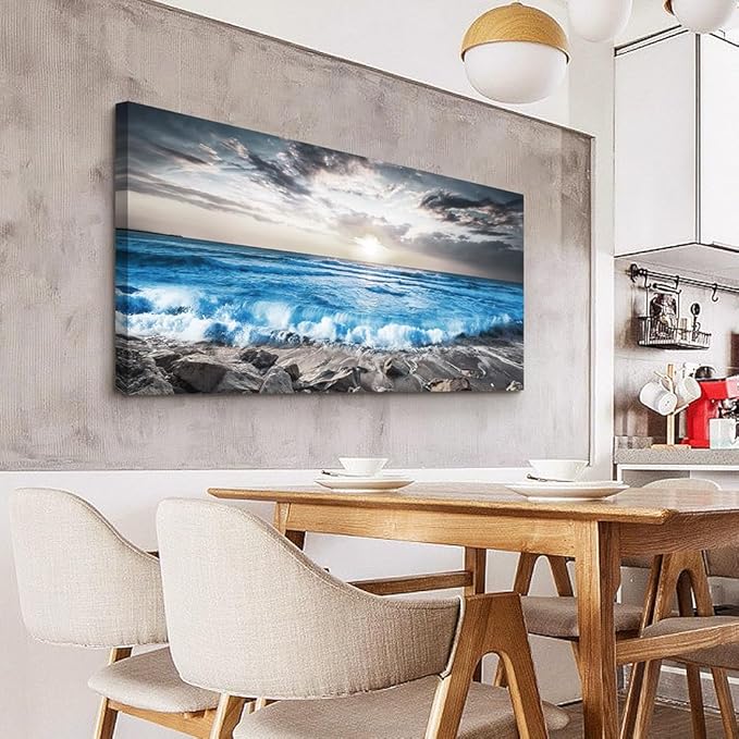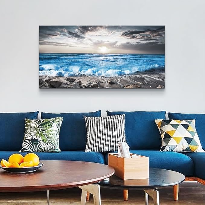 Lapremoly Large Wall Decoration For Living Room Framed Canvas Wall Art For Bedroom Office Wall Decor Black And White Beach Wall Painting Blue Sea Wave Pictures Artwork Modern Hotel Room Home Decor