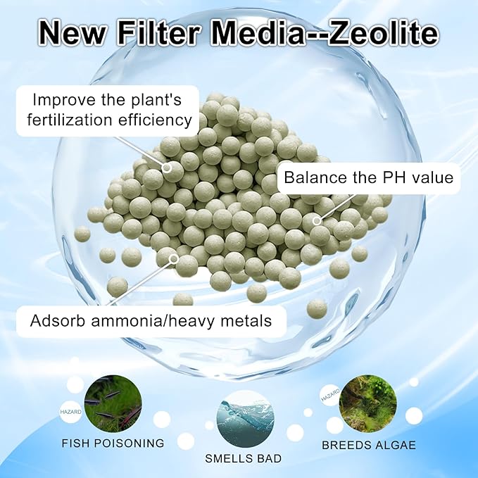 - Our Filter Cartridges for Aquarium Add Newest Filter Media-Processed Zeolite: Compared to crushed granule zeolite, our spherical zeolite is cleaner and more advanced, It can adsorb ammonia, heavy metals and other harmful components. Balance the PH value to achieve a stable water state. Improve the fertilization efficiency of aquatic plants, make your aquatic plants grow faster and healthier
