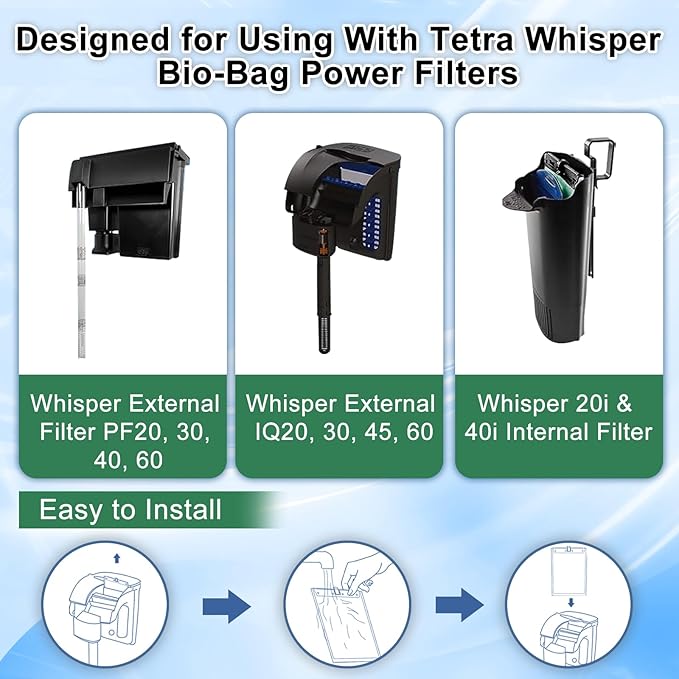 - 6pcs Large Assembled Replacement Filter Cartridges compatible with Whisper Bio-bag Filters: Unit Size: 5.1 * 6.7 inches. This filter cartridge for aquarium is compatible with whisper bio-bag external filter PF20, PF30, PF40, PF60, whisper external filter IQ20, IQ30, IQ45, IQ60, whisper 20i & 40i internal filter and ReptoFilter 50 gallons (125 GPH).
