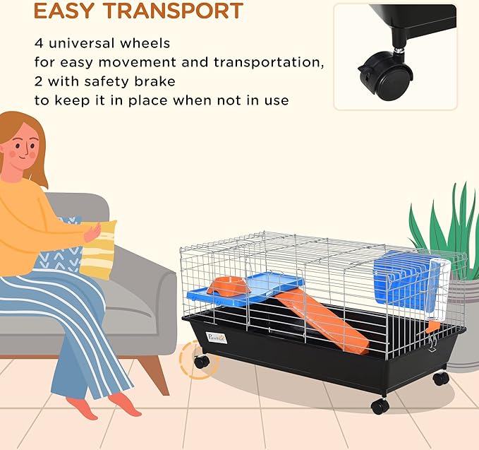 PawHut 35" L Small Animal Cage, Rolling Bunny Cage, Guinea Pig Cage with Food Dish, Water Bottle, Hay Feeder, Platform, Ramp for Chinchilla, Black