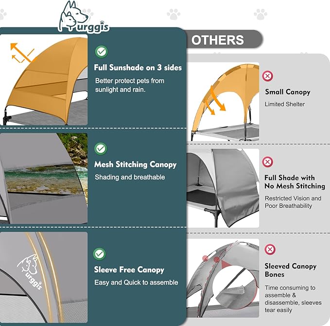 - Wide Application: With the unique adjustable feet, this bed is great for outdoor use beach, picnic, camping, yard, patio, it keeps pets cool, dry and off bugs for a great outdoor time. We can also remove the canopy to provide dogs a comfortable place to spend their indoor time. This dog cot bed is under Furggis 100% satisfactory guarantee. If you have any questions with it, please tell us, we will get back to you within 24 hours and work it out for you as soon as possible.