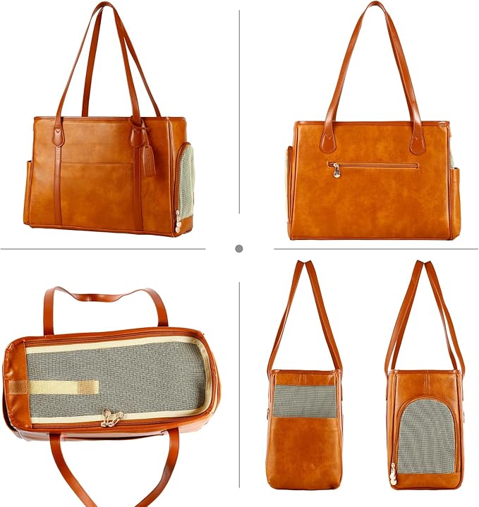 Stylish Dog Purse Carrier, Leather Pet Carrier Bag for Small Dogs Cats Puppy, Airline Approved Soft-Sided Carrier Brown