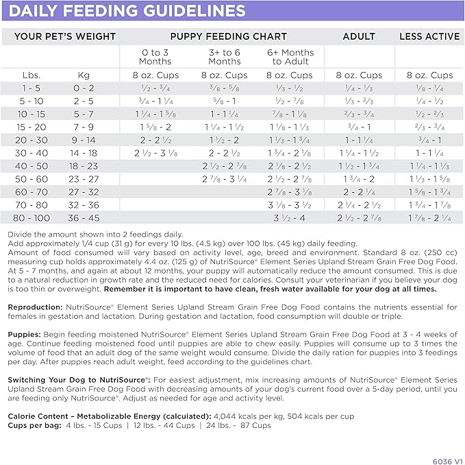 - NutriSource Element Series Upland Stream is formulated to meet AAFCO guidelines for all life stages