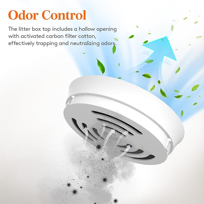 - Odor Control: The top of the litter box features a hollow opening that houses an activated carbon filter cotton which effectively filters odors, ensuring that smells are trapped and neutralized. The activated carbon, measuring 7.9" (20cm) in diameter, can be replaced after use to maintain optimal odor control. Additionally, the closed bin design of the litter box locks trash, dust, and dander within the bin, promoting a clean and tidy surrounding area.