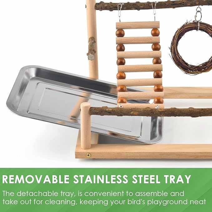 - FUN BIRD PLAYSTAND: The conure play gym, comes with rattan chew toy, hanging swing and ladder, two feeding cups and a removable tray. Your bird can climb the assembled rotating perches, or swinging, or climb the ladder for digestion after enjoying treats. Easy to clean the cups and tray. A perfect cage addition to meet your bird's daily play needs.