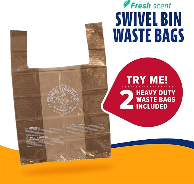 - Two Heavy Duty Waste Bags Included: Two Arm & Hammer baking soda scented waste bags are included, featuring double the thickness of standard grocery bags for added durability and odor control. Additional Arm & Hammer Swivel Bin Waste Bags are available for purchase separately.