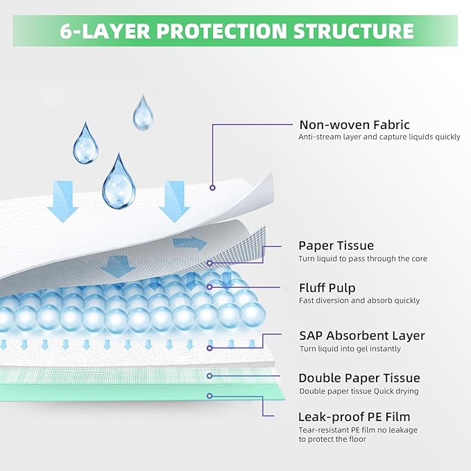 - SUPER ABSORBENT: Cat litter pads have a 6-layer thickened design and a super absorbent SAP core to help absorb liquid better. Each pet pee pads for cats can absorb 2-3 days of urine for one cat and can hold up 14 cups of urine