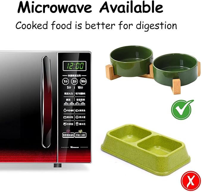 - EASY TO CLEAN CERAMIC - This easy clean dog bowl set is dishwasher proof, as well as easy to handwash and wipe down. With thick walls, these ceramic bowls for pets are sturdy, weighty yet not too heavy. Double Bowl Design:One dog bowl for food and one for water, Each ceramic cat bowl has a Unique wooden stand, raising the dishes closer to your pet for more comfortable eating