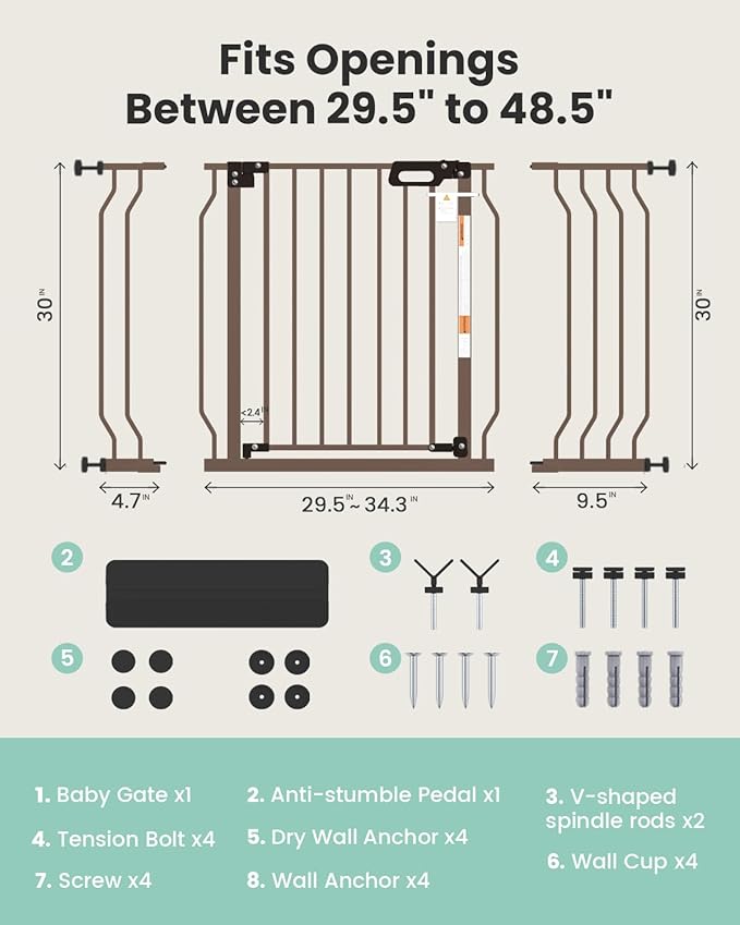Mom's Choice-GROWNSY Baby Gate for Stairs, 29.5"-48.4" Pressure Mounted Baby Gate for Top of Stair&Doorway with V-Shaped Rods, Anti-Trip Pedal,Wide Stairs Dog Gate Easy Install w/Red Reminder,Brown