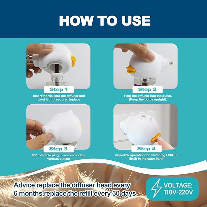 - How to Use: It is very simple to use the feline pheromone diffuser kit, you just need to plug it in and it will start releasing natural calming cat pheromones for your feline friends. The diffuser head can be rotated 90 degrees to allow horizontal and vertical adjustment for optimal Settings. The cat diffuser kit has a maximum service life of 30 days, so replace it every 30 days. Also for best results, make sure to insert your feline pheromone diffuser into the tuyere and place it where your cat spends the most time.