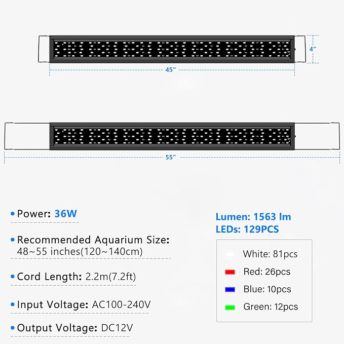 AQQA Aquarium Light,Full Spectrum Fish Tank Light for Plants,3 Mode+Timer+Adjustable Brightness,High Brightness LED Beads with Extendable Brackets for Freshwater (36W for 48-55inch)