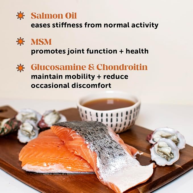 - Made with Natural Ingredients Like Salmon Oil, Glucosamine + Chondroitin, & More: For your pup’s wellness, we use natural ingredients that truly work. Omega-rich salmon oil enhances mobility, while glucosamine and chondroitin support joint health and flexibility. MSM aids in joint function, and fish oil benefits joints, skin, brain, heart, and overall health. Collagen-rich bone broth adds a protein boost.