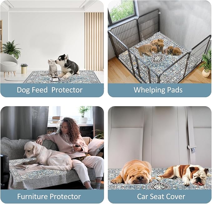 - 🐾【𝐄𝐧𝐡𝐚𝐧𝐜𝐞𝐝 𝐍𝐨𝐧-𝐒𝐥𝐢𝐩 𝐏𝐞𝐫𝐟𝐨𝐫𝐦𝐚𝐧𝐜𝐞】Upgraded with non-slip PVC rug at the bottom, this mat firmly stay on the floor or crate, ensuring the safety of your dog. Not only do puppy reusable pee pads protect against scratches and dirt, they also feature stylish tie-dye and bohemian designs that add a decorative touch to your home.