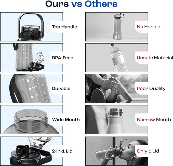 - 2-in-1 Chug & Straw Lid - Our half gallon water jug comes with a dual functionality lid that allows you to chug or sip without having to change the lid. The smart, off-centre placement of the lid lets you use both the spouts with ease - sip while you work and chug after a rigorous workout!