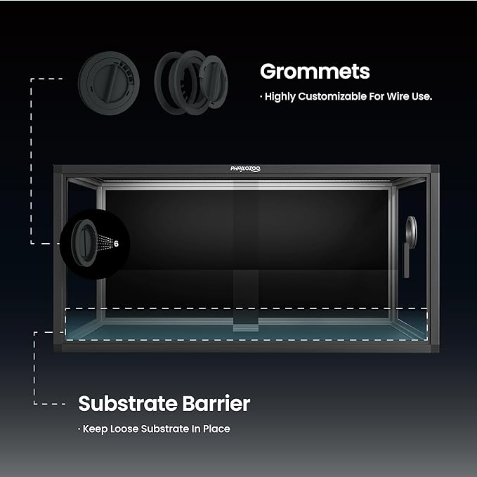 - 【Easy Maintenance】Front opening reptile terrarium with door handles included for easy cleaning & feeding. No more suction cup problems or unsightly fingerprints all over. The substrate barrier keeps the substrate in place. Our tempered glass doors are durable enough to withstand scratching.