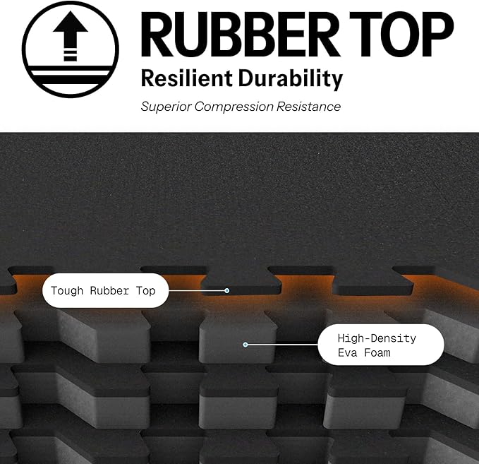- [Upgraded Dual-Layer Design]: Concerned about your equipment scratching the floor during workouts? Our 2in1 Rubber Top EVA Foam Exercise Gym Mats are crafted to solve this issue. The textured rubber top layer, combined with a high-density EVA foam bottom layer, seamlessly creates a non-slip tough surface with excellent shock absorption.