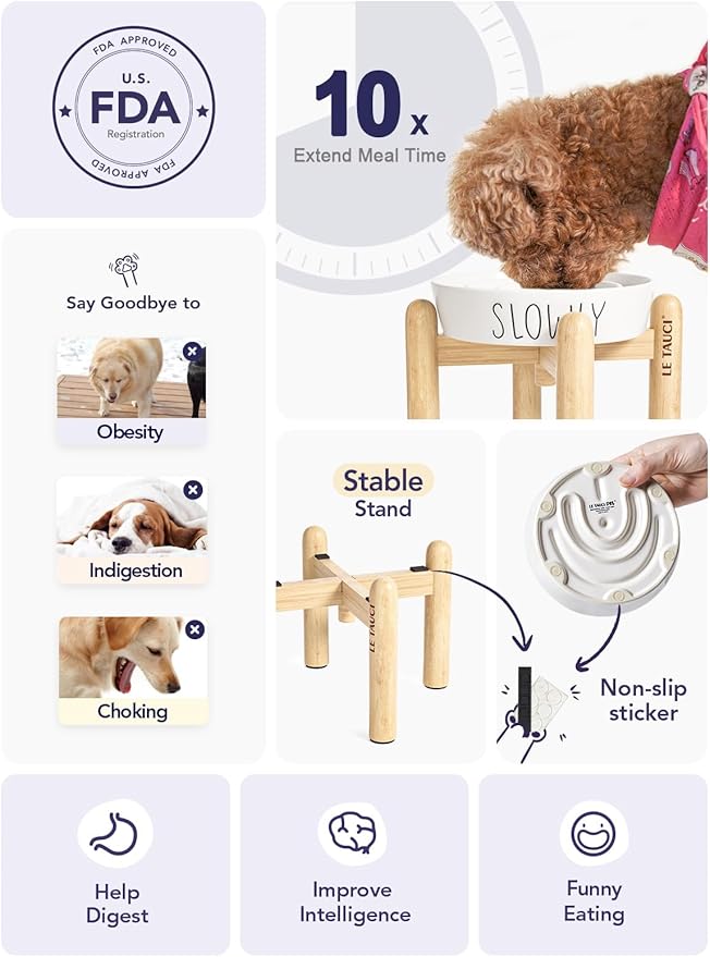 - Slow Down Eating, Bring Dog A Healthy Diet - Fast-eating dogs experience bloat, regurgitation, and obesity easily. Our slow feeder dog bowl design with the ridges and maze pattern helps your dog to eat slower than 21 times. Your dog could change his overeating behavior through a challenge and fun mealtime.