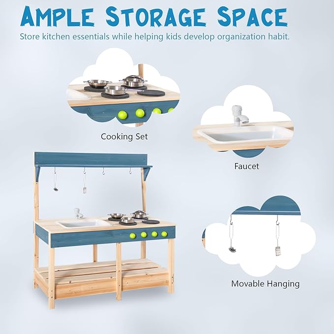 - Perfect Gift for Toddlers: Designed with child-sized proportions and practicality in mind, our mud kitchen is an ideal gift for birthdays and special occasions. Children can enjoy cooking games while developing hands-on skills and hand-eye coordination.