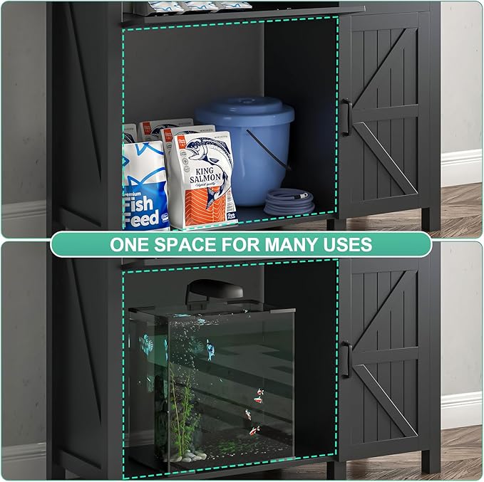 - 🐬【Flexible Storage Space】This aquarium stand also comes with a drawer and a large door storage cabinet with a adjustable shelf, you can easily organize fish food, cleaning tools, gravel cleaner and other accessories. Under the tabletop, is a samll space for ※20 gallon tank※, two birds with one stone.
