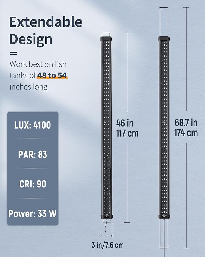 - For 48" to 54" Tanks: With an extendable bracket (min length: up to 46"; max length: up to 68.7"), the LED aquarium light always stays steady on the fish tank. Work best on tanks of 48 to 54 inches long.