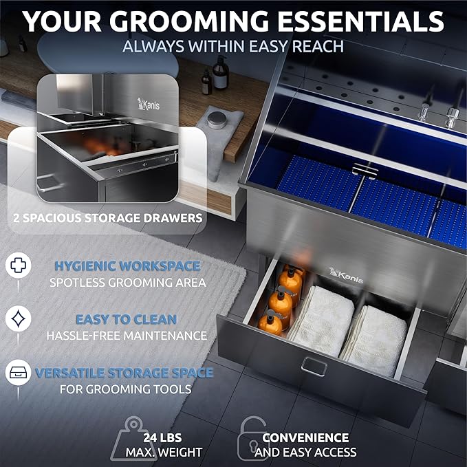 - SPACIOUS STORAGE & HYGIENIC SETUP: Two sliding drawers, each holding up to 24 lbs, provide generous space for grooming tools and accessories. Keep essentials within reach while maintaining a clean pet wash station with hassle-free upkeep
