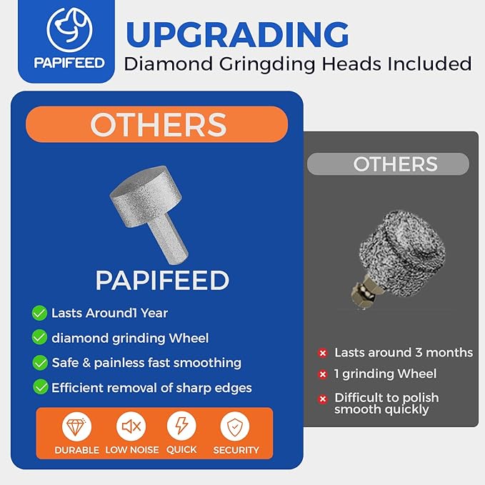 - 【Dust-Proof Splash Guardz】PAPIFEED dog nail clippers adopts an exclusive transparent dust cover design to capture grinding debris in real time and prevent nail dust from flying everywhere.Hygienic cleaning is clear at a glance, protecting the health of you and your pet while reducing the burden of household cleaning.