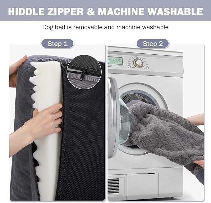 • 🐶WATERPROOF & WASHABLE DOG BED: The dog bed features a removable, machine-washable cover with a zipper for easy to quick remove and care, so just throw it in the washing machine and will be as good as new, ensuring your pet's space stays fresh and hygienic. The waterproof inner lining fully protect the foam from spills, water damage, or accidents, prolonging the product's life.