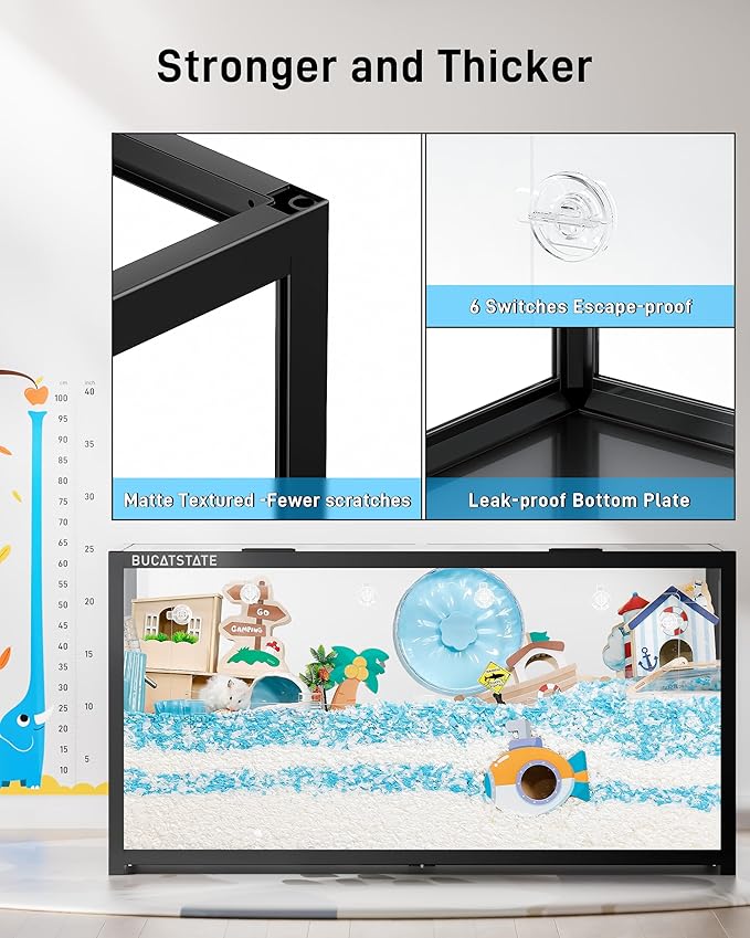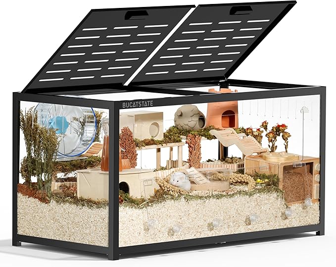 - 【Chew-proof & Sturdy Hamster Tank】Made with thickened clear acrylic panels and a chew-proof metal frame, this dwarf hamster cage is perfect for keeping your little escape artist safe. Four clear-view windows allow you to easily spot your pet at any time.