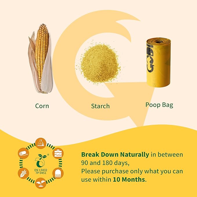 - π± ECO-friendly materials: Codirom dog poop bags are made of corn, vegetable oil, and PBAT (a fully compostable polymer). Keep the bags away from heat sources and store in a cool, dry place. The available time of compostable bags is nearly 12 months, so purchase only that will be used within 10 months.