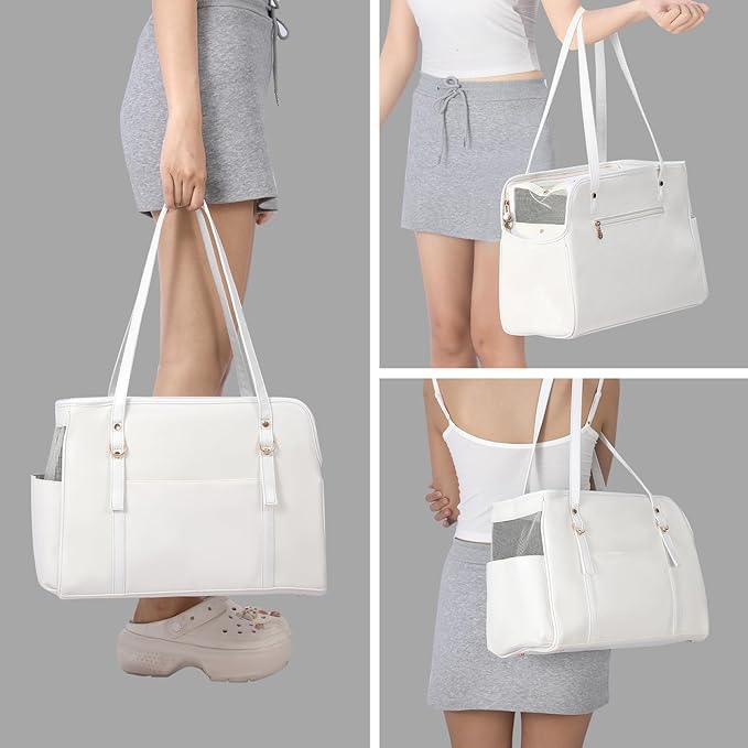Dog Carrier Purse, Fashion Leather Pet Carrier with Pockets, Airline Approved Soft Sided Dog Carrying Bag for Puppy Cat Dog White