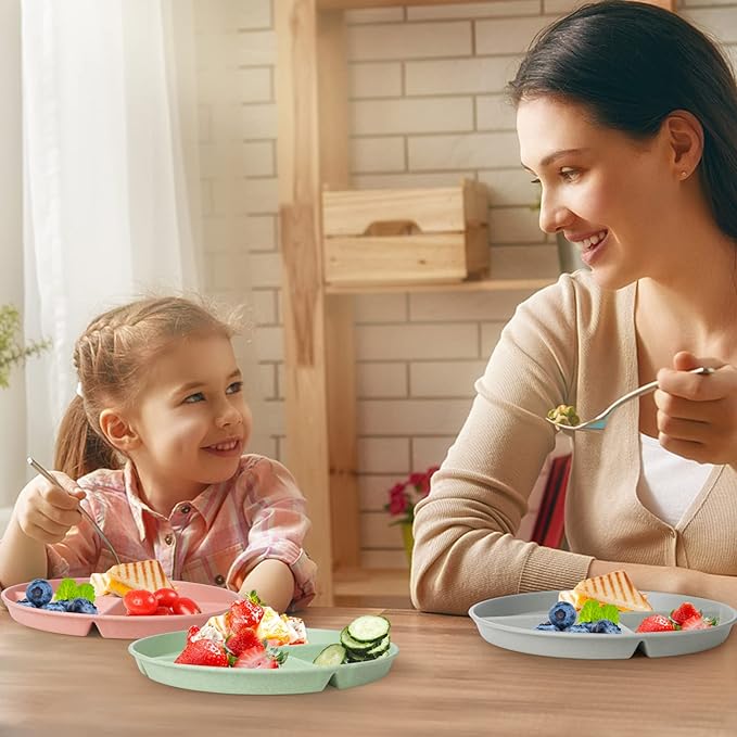 greenandlife 10 Inch 4PCS Unbreakable Portion Control Plates, Divided Plates for Kids Adults, Dishwasher & Microwave Safe Compartment Plate, Lightweight Reusable Wheat Straw Plate, BPA Free
