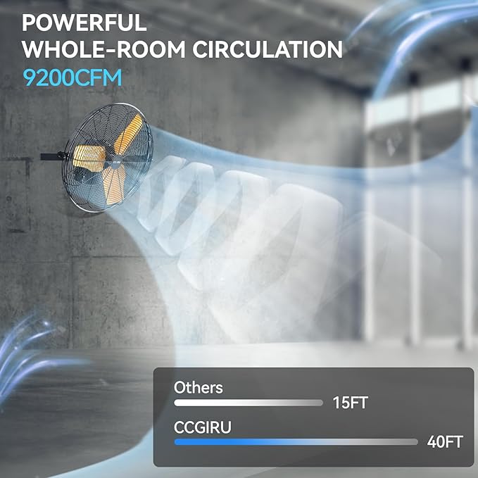 - Much Longer Airflow Movement: Due to the new tech, CCGIRU's heavy duty industrial fan delivers longer circulating breeze for large spaces, the blowing distance reach to 40 ft in high speed. Great for industrial, commercial, garage, warehouse, workshop, and Barn