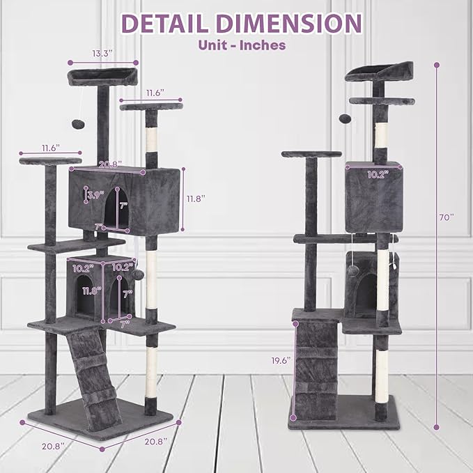 70 inches Cat Tower for Indoor Cats Multi-Level Cat Condos for XL Cat Tree Cat Climbing Tower with Scratching Posts, Hanging Toys,Light Gray