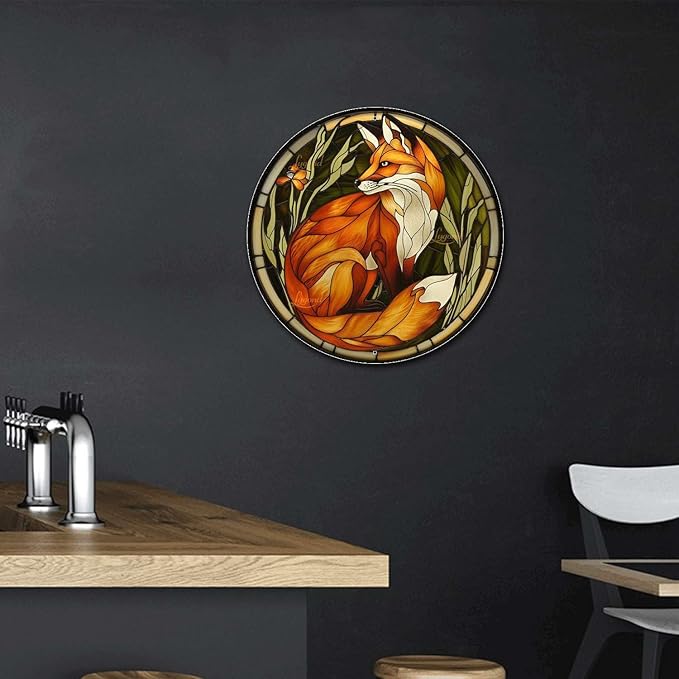 Lygond Metal Sign Tin Sign Circular Stained Glass Red Fox Sign Garden Outside for Patio 12×12 Inches